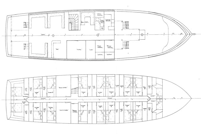 Die liebevoll eingerichteten Doppelkabinen lassen keine Wünsche offen. Ausreichend Schrankraum bietet Platz zum Verstauen der Garderobe. Die Ausstattung mit viel Holz und hochwertigen Lampen sowie Klimaanlage schaffen ein anspruchsvolles, maritimes Ambiente. Selbstverständlich verfügt jede Kabine über ein eigenes Bad en-suite in einer ebenfalls hochwertigen Ausführung.Salon - Sonnendeck