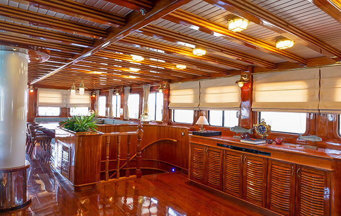 Der fast 140 qm große Salon in edler Ausführung teilt sich in 3 großzügige Sitzecken auf. Am Vorderdeck befindet sich die offene Bar und Sitzplätze. Relaxen und die Seele Baumeln lassen kann man auf dem überdurchschnittlich großen Sonnendeck mit ausreichend Liegemöglichkeiten.